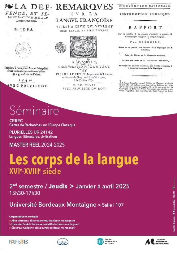 Les enquêtes du CEREC sont autant de jalons qui permettent d’interroger voire de remettre en question la notion de classicisme européen ; elles portent plus particulièrement sur la théorisation des genres et des formes de discours (verbaux ou non) pratiqués aux XVIIe et XVIIIe siècles, au regard des modèles poétiques, rhétoriques, iconographiques, etc. et sur l’imaginaire de la langue classique et les représentations imaginées du vivre ensemble.