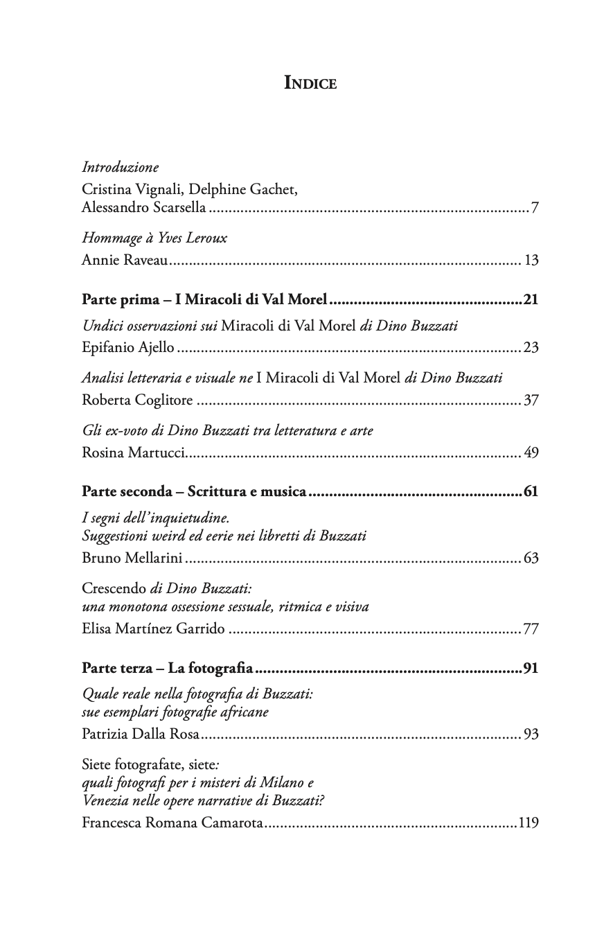 Après le volume Buzzati e il Segno. Narrare il nuovo, avec lequel – à l’occasion du cinquantième anniversaire de la mort de Dino Buzzati – a été entrepris un itinéraire critique consacré à l’expressivité picturale et graphique ainsi qu’à la fusion du mot et de l’image chez Buzzati, ce deuxième volume, Buzzati e il Segno. Scrittura e visività, en plus de se concentrer sur les formes narratives et la culture visuelle d’une œuvre comme I Miracoli di Val Morel, s’ouvre à de nouvelles approches intermédiales, qui voient Buzzati engagé en tant que librettiste d’opéra et auteur de chroniques musicales, en tant que photographe, photoreporter, co-auteur de photo-textes, ou en tant qu’auteur de chroniques d’art et graveur. Le volume permet également d’explorer la dimension urbaine dans l’œuvre de Buzzati ainsi que d’autres espaces et spatialités dans sa production, à travers l’apport des outils de la culture visuelle.